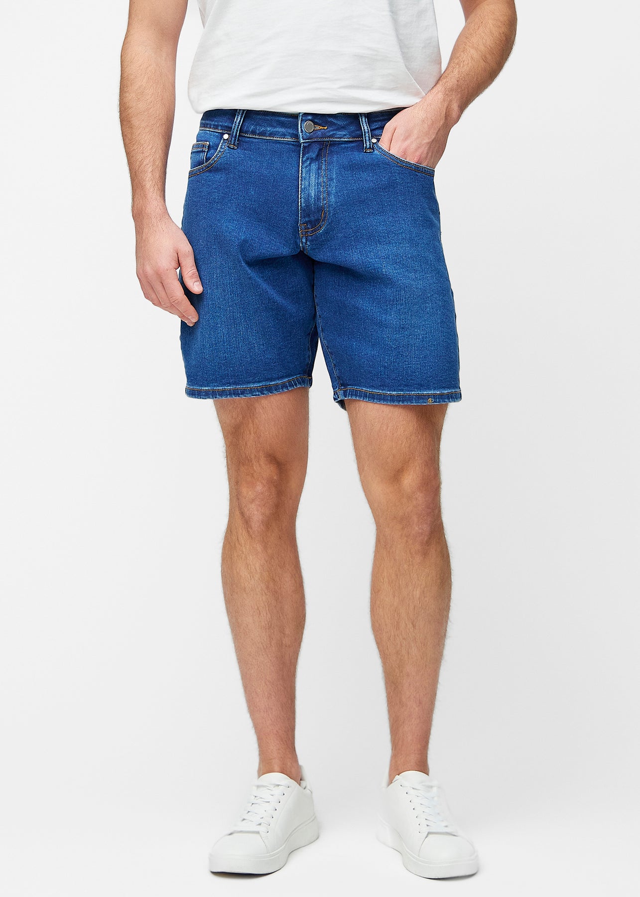 Perfect Shorts - Middle - Regular - Oceans™ Perfect Shorts - Middle - Regular in Oceans are dark blue denim shorts for men with a clean and classic look. The fit sits naturally at the hips and has a straight fit that leaves room around the thighs for a comfortable silhouette. The shorts are mid-length and reach just above the knee. The deep pockets at the front and back make them practical and suitable for everyday wear.