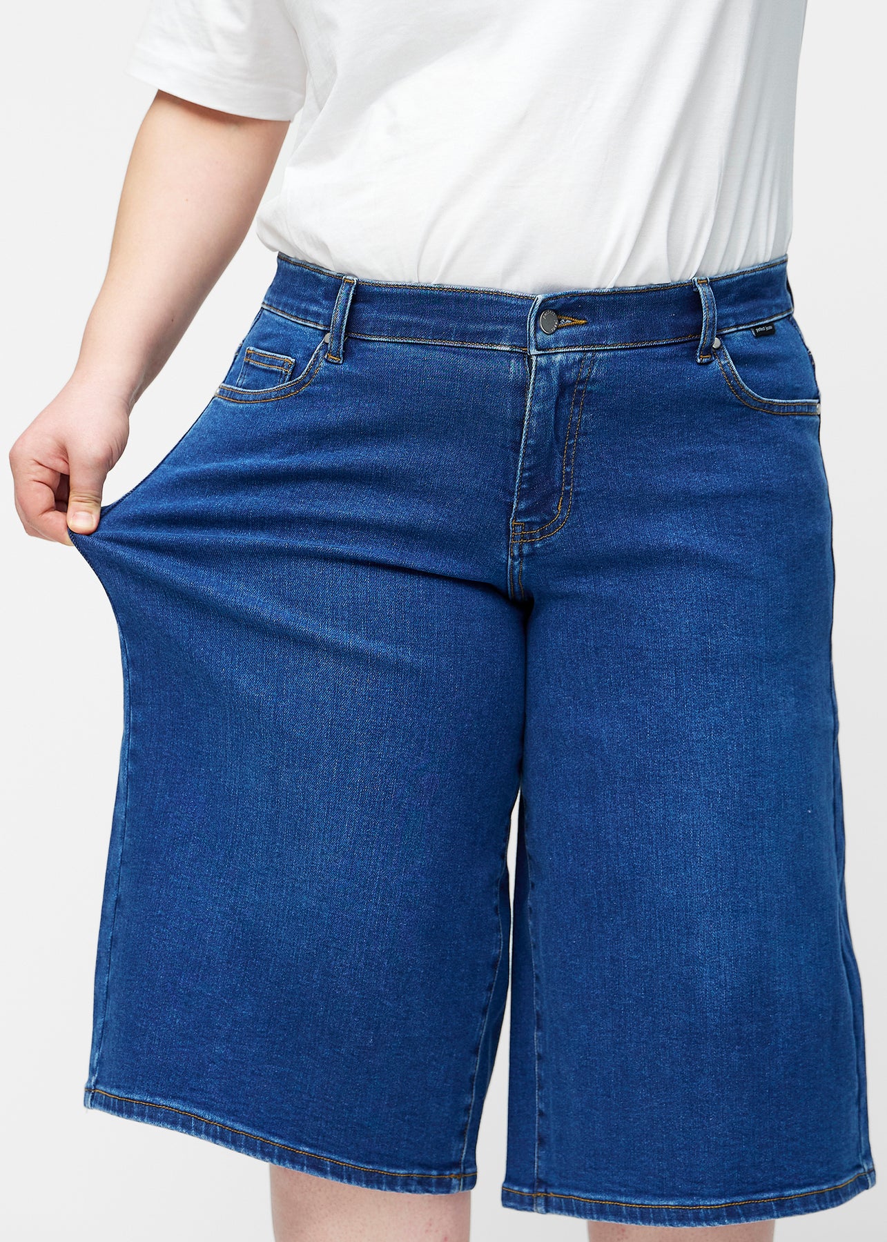 Fuldt billede af plus-size model i løse, mørkeblå denim capris i farven Oceans, der går til lige under knæet.