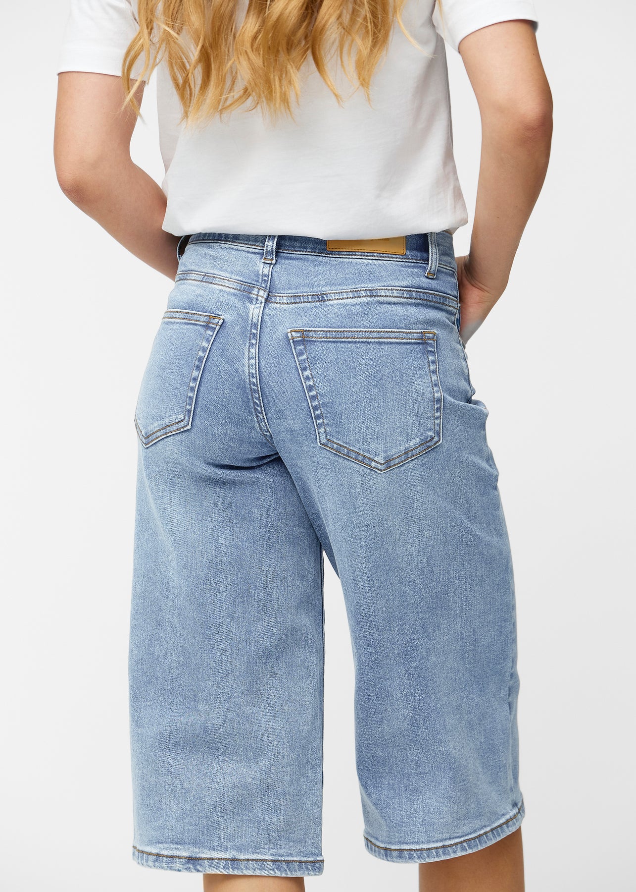 Loose, light blue denim capris in the colour Waves seen from the side on a model, where the wide fit and length to just below the knee are visible.