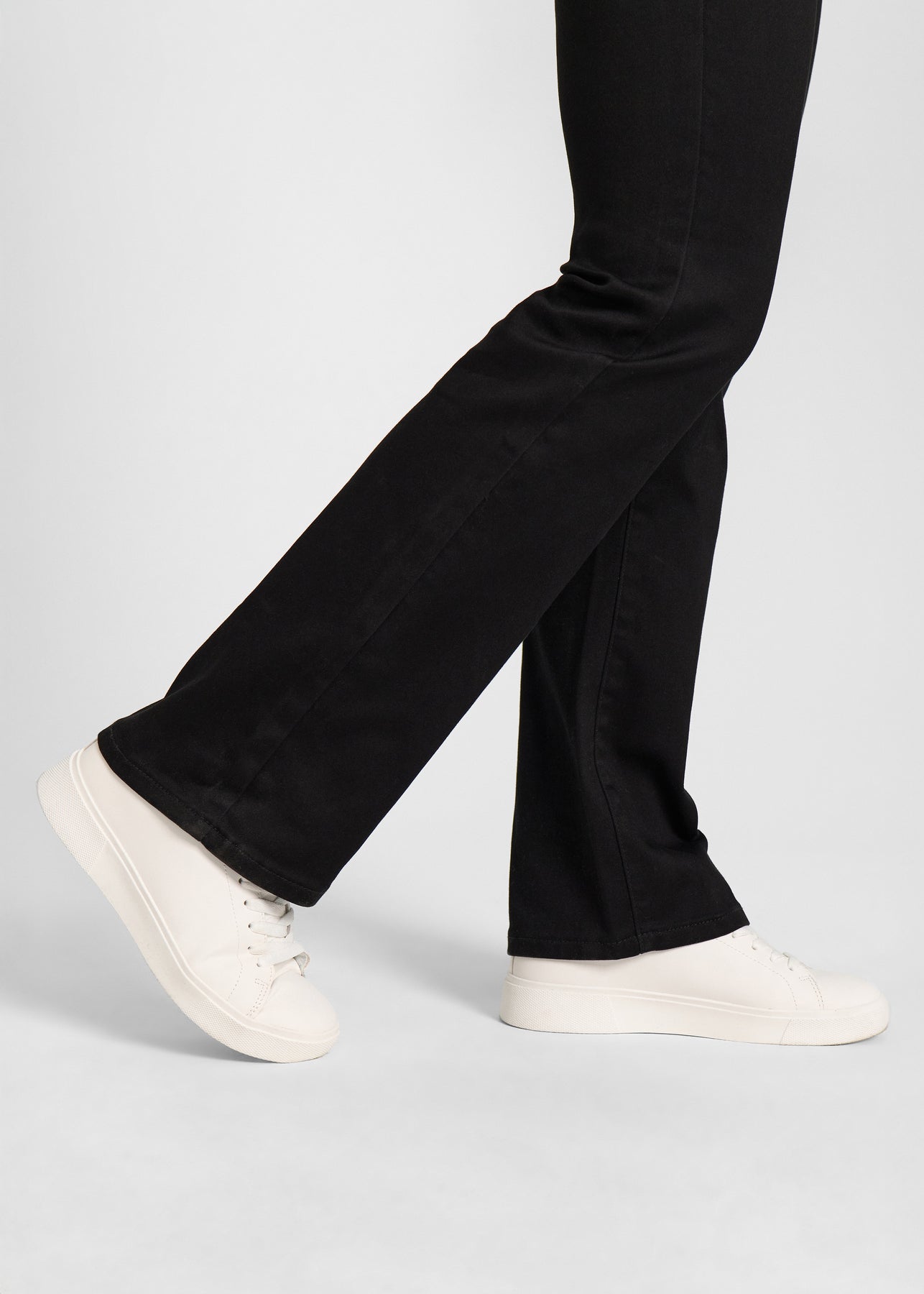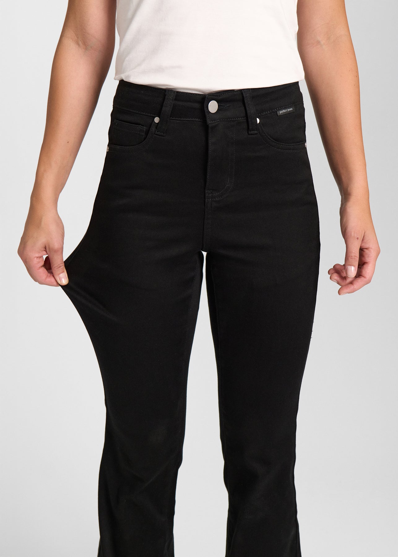 Perfect Jeans - Bootcut - Ravens are black jeans with a clean and stylish look. They are designed to fit closely around the thighs, hips, and waist, featuring the classic bootcut flare from the knee down. The material has plenty of stretch, providing the perfect balance between comfort and fit. The bootcut jeans are high-waisted and have practical pockets at both the front and back. In addition, they are made with a special weave that ensures the jeans maintain both their colour and shape after wear and washing.