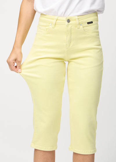 Perfect Capris - Regular - Lemonades are the perfect yellow capris for you, who are looking for a comfortable and airy ¾-length jeans. The fit is snug at the waist and hips, but looser on the thighs, so you get both comfort and freedom of movement. They are high-waisted and have two deep pockets both in the front and back. The material is soft and stretchy, making them comfortable to wear all day. The fresh yellow color remains beautiful wash after wash.