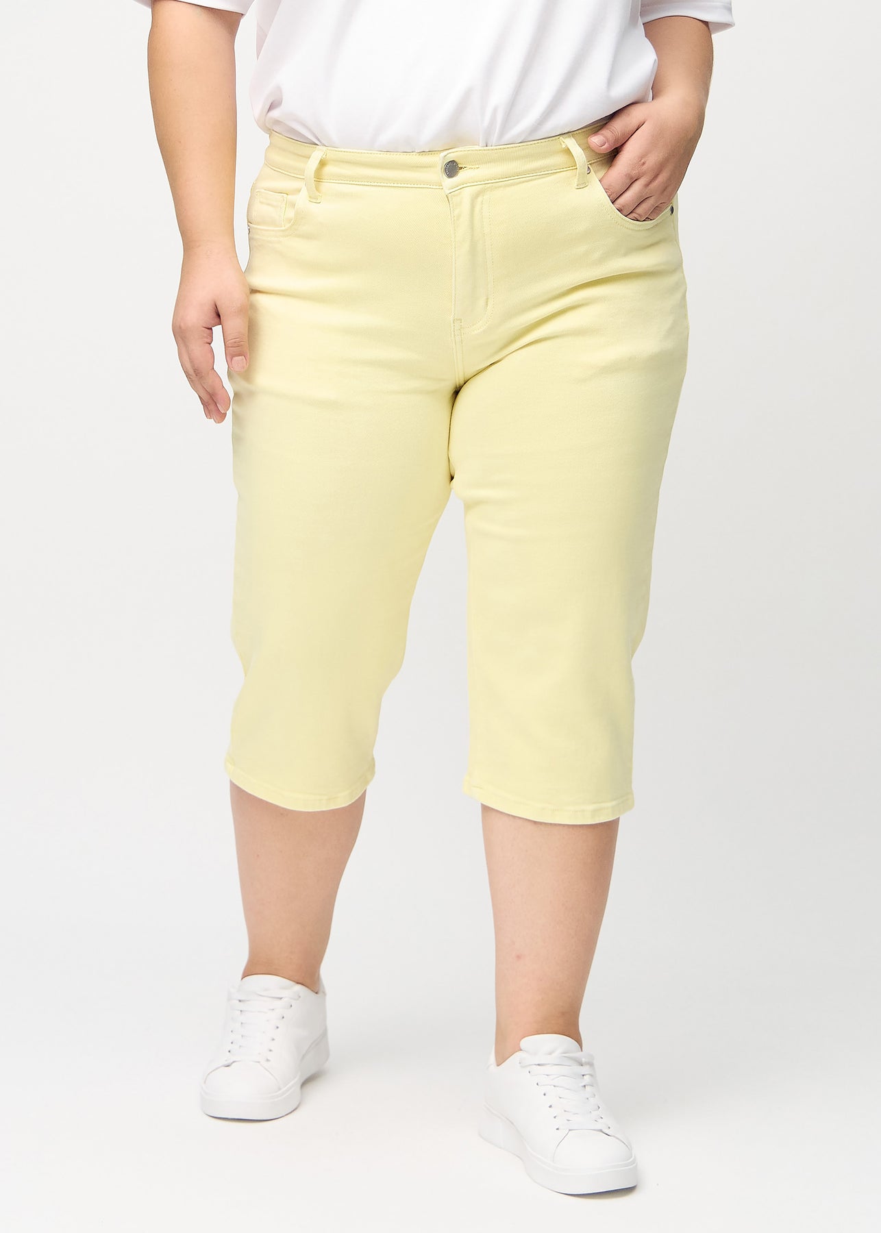 Forlommen på et par lysegule regular capris, hvor man kan se logoet på en plus-size model.