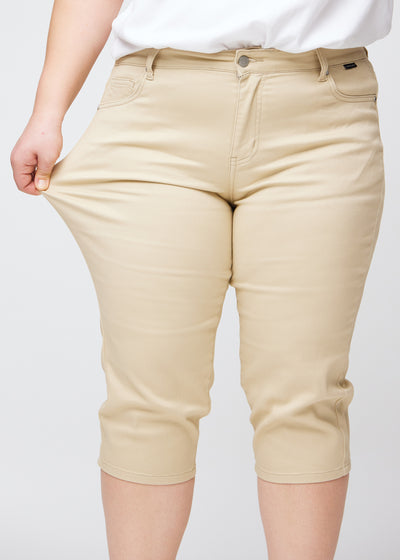 Beige slim capris, farve Gazelles, med tætsiddende pasform og længde lige under knæet – set forfra på plus-size model.