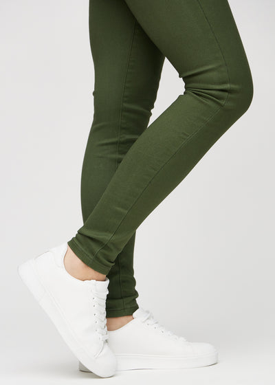 Mørkegrønne skinny jeans, modelnavn Renewals, som sidder tæt til benet, set forfra.