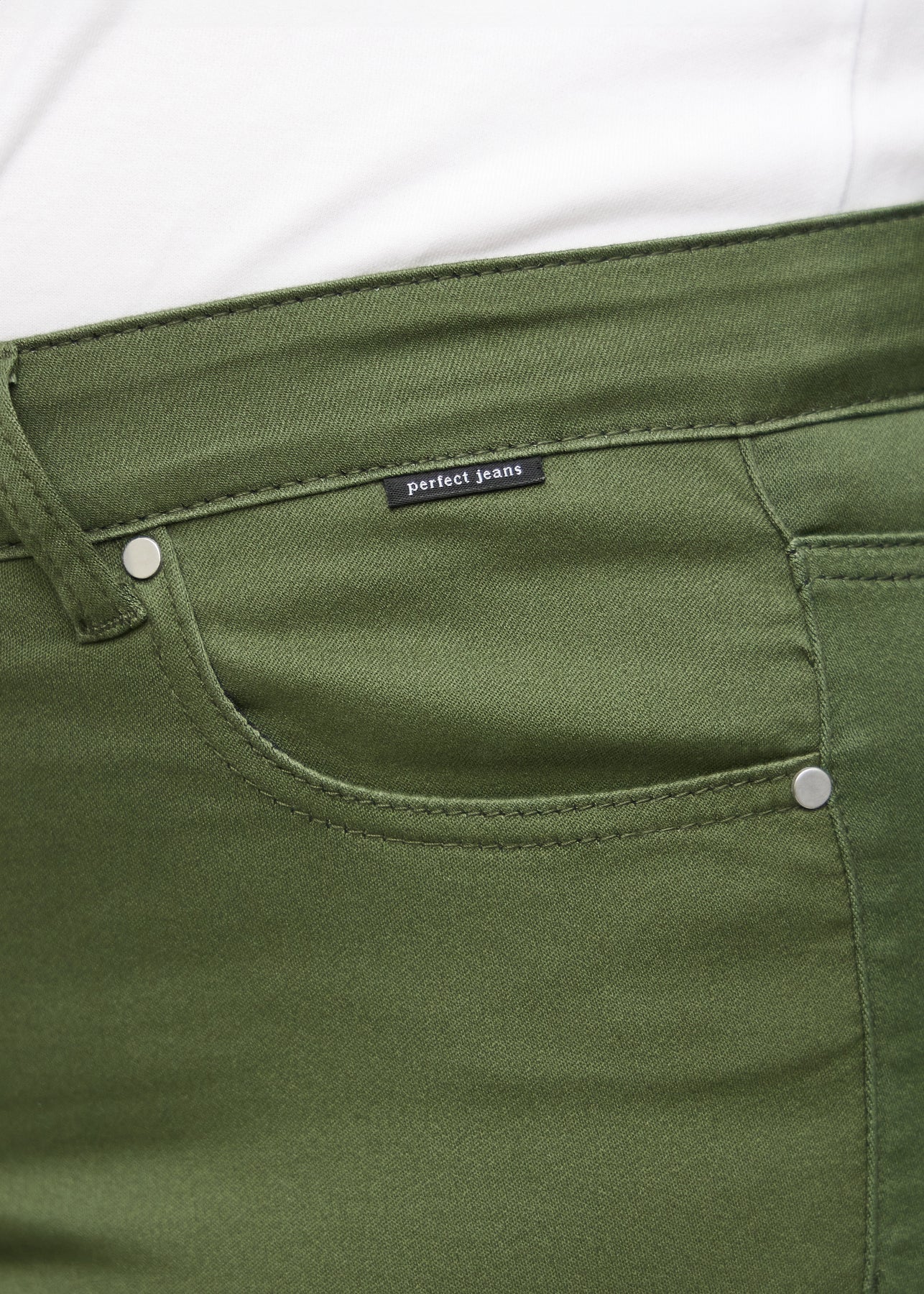 Mørkegrønne skinny jeans set fra siden på en plus-size model.