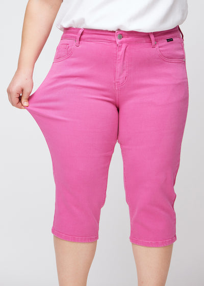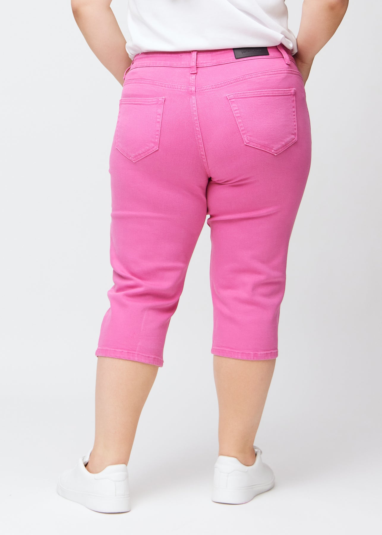 Lyserøde slim capris, farve Flamingos, med tætsiddende pasform og længde lige under knæet – set forfra på plus-size model.