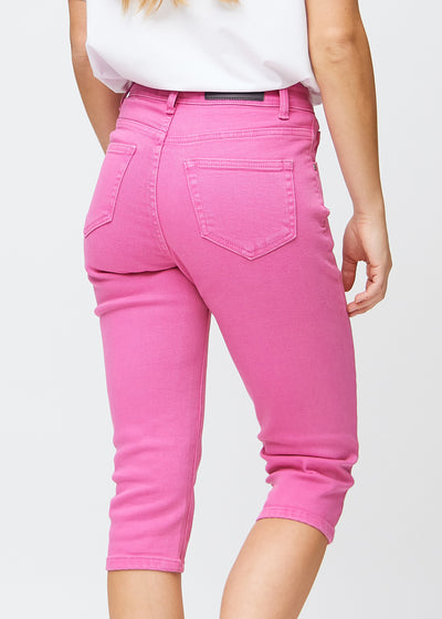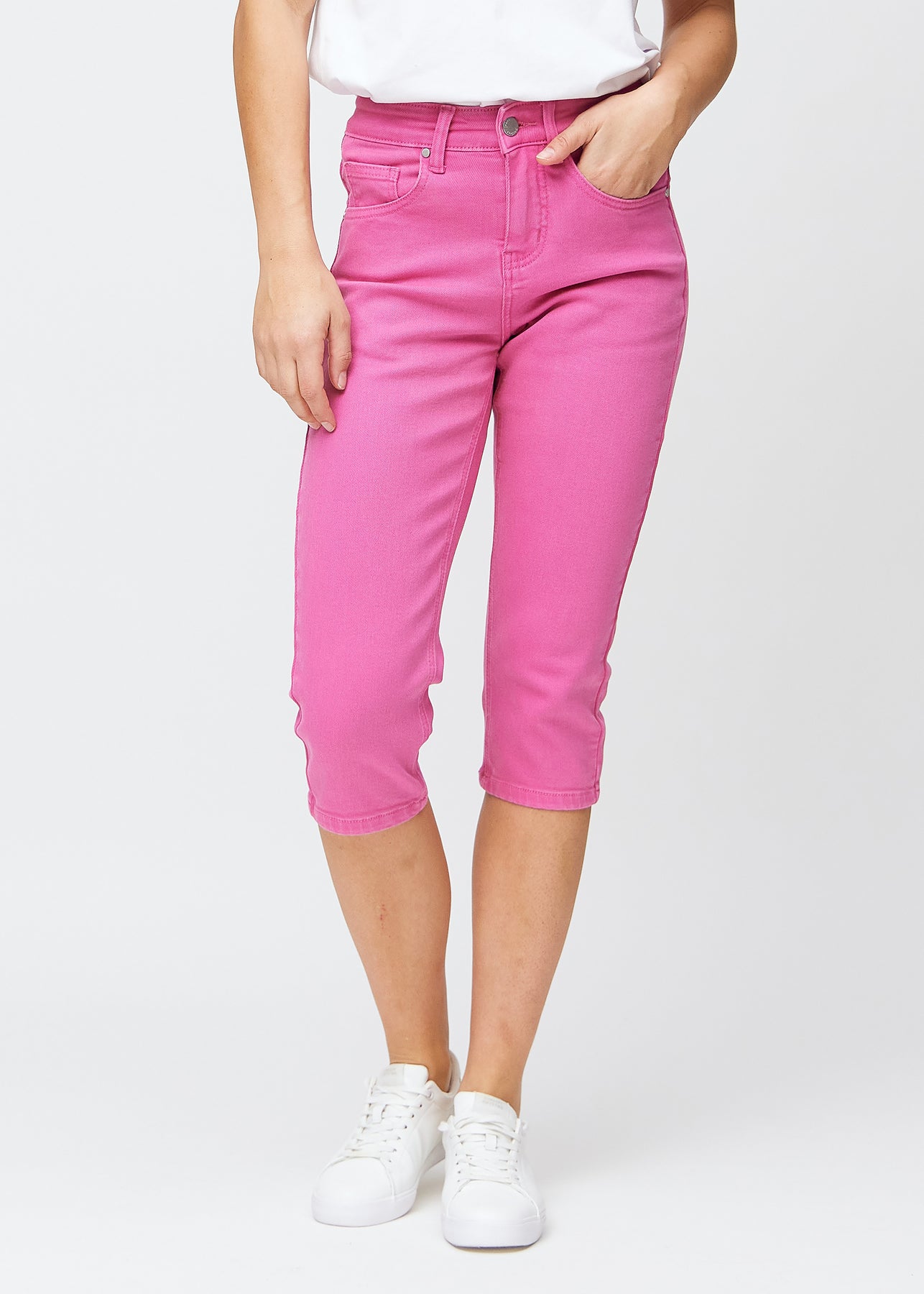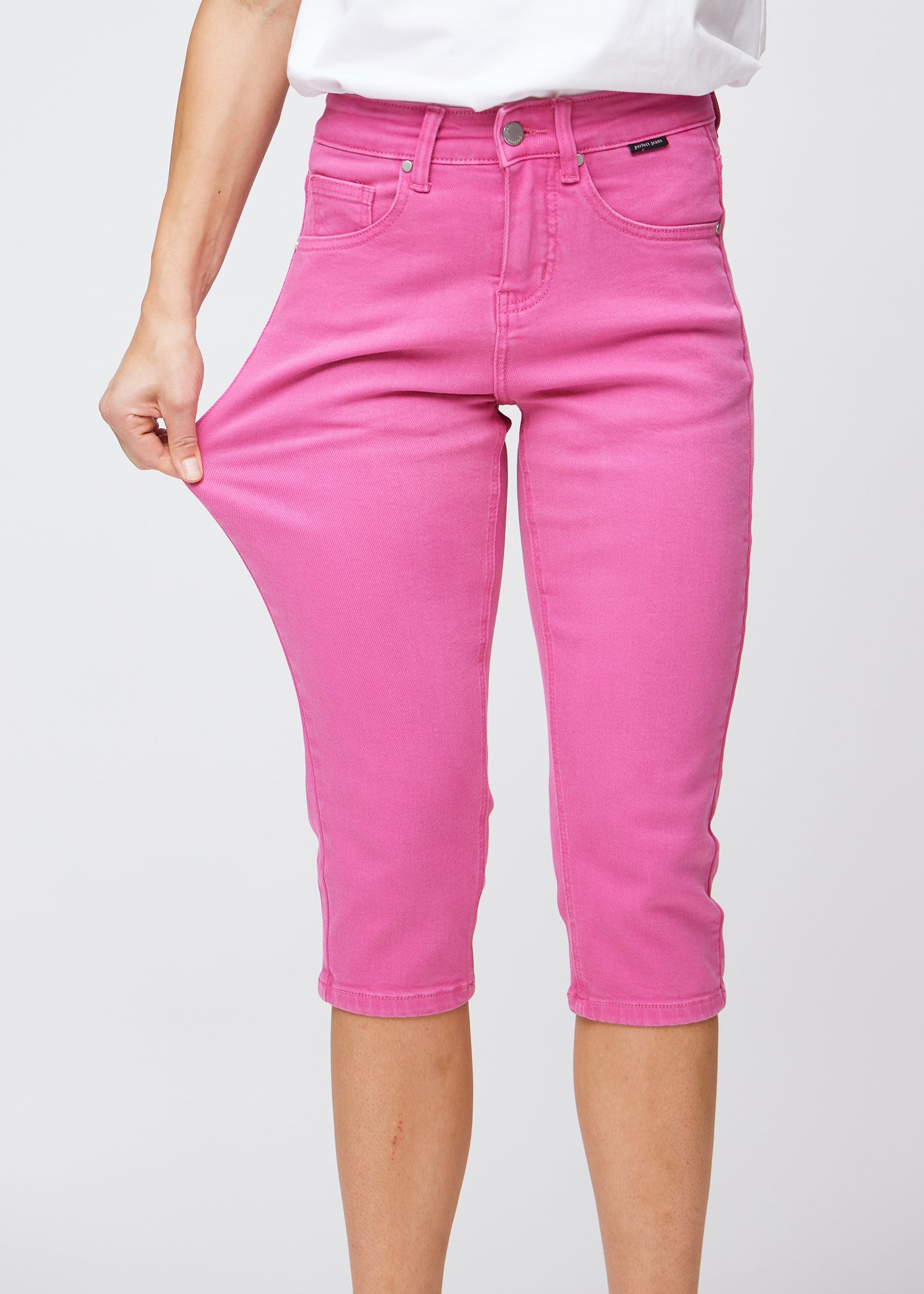 Lyserøde slim capris, farve Flamingos, med tætsiddende pasform der former benene og slutter lige under knæet – set forfra.