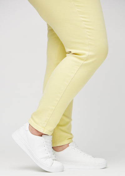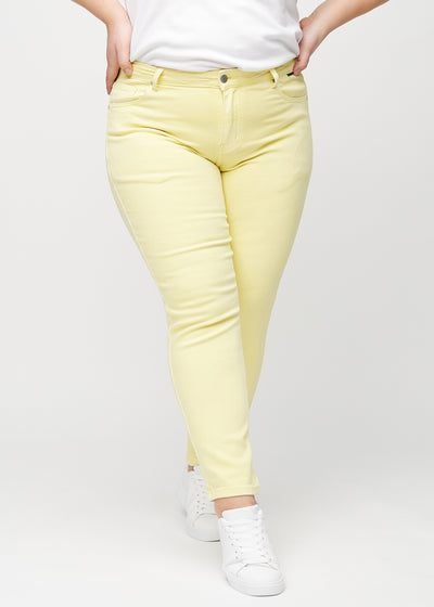 Lysegule slim jeans, modelnavn Lemonades, som sidder tæt til benet, dog lidt løsere ved anklen, på en plus-size model, set forfra.