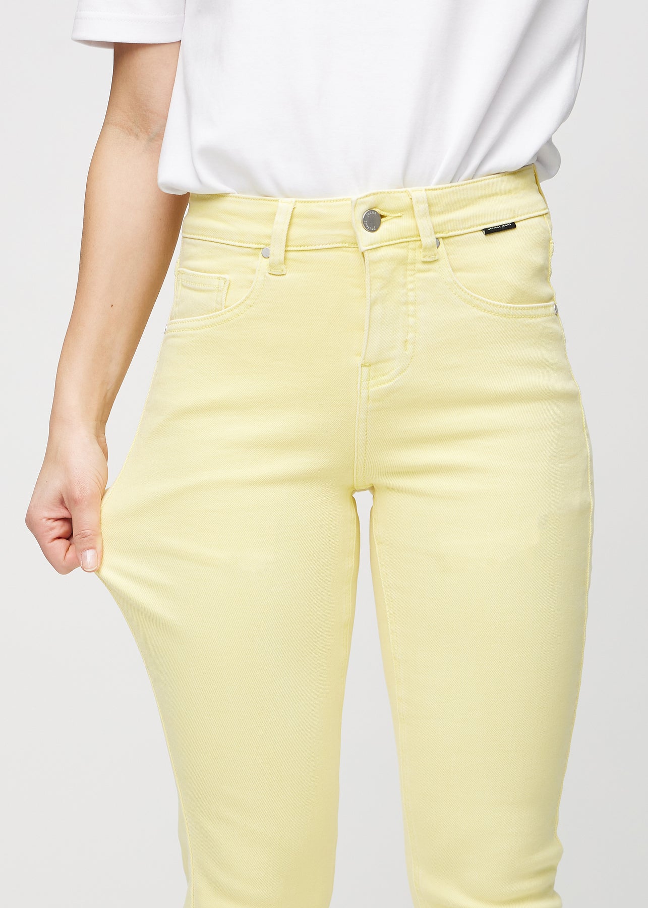 Lysegule slim jeans set fra siden på model.