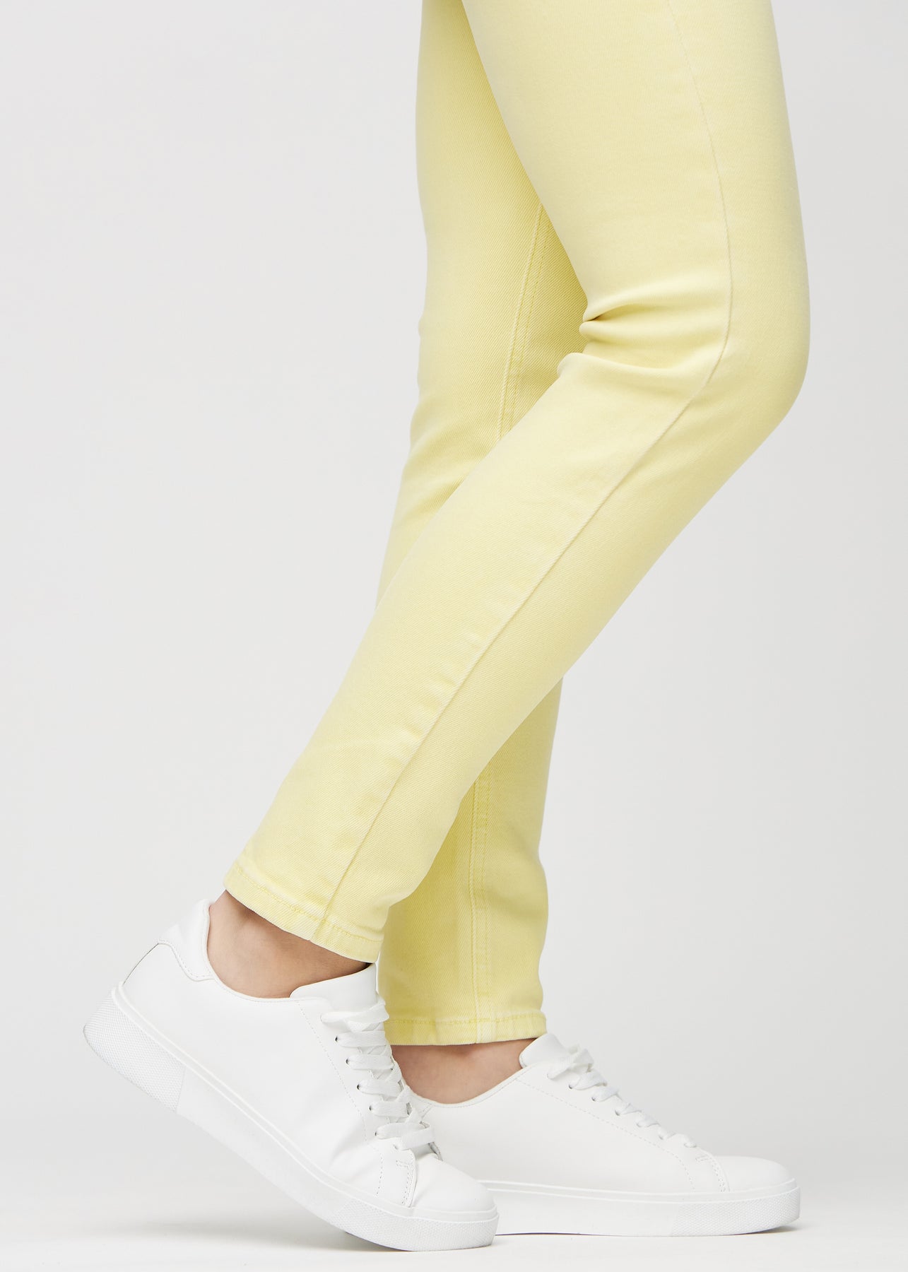 Lysegule slim jeans set bagfra tæt på en plus-size model for at vise detaljer.
