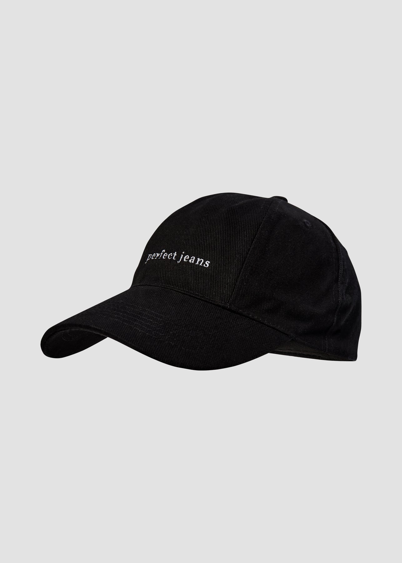 Sort kasket fra Perfect Jeans, med hvidt logo, set forfra.