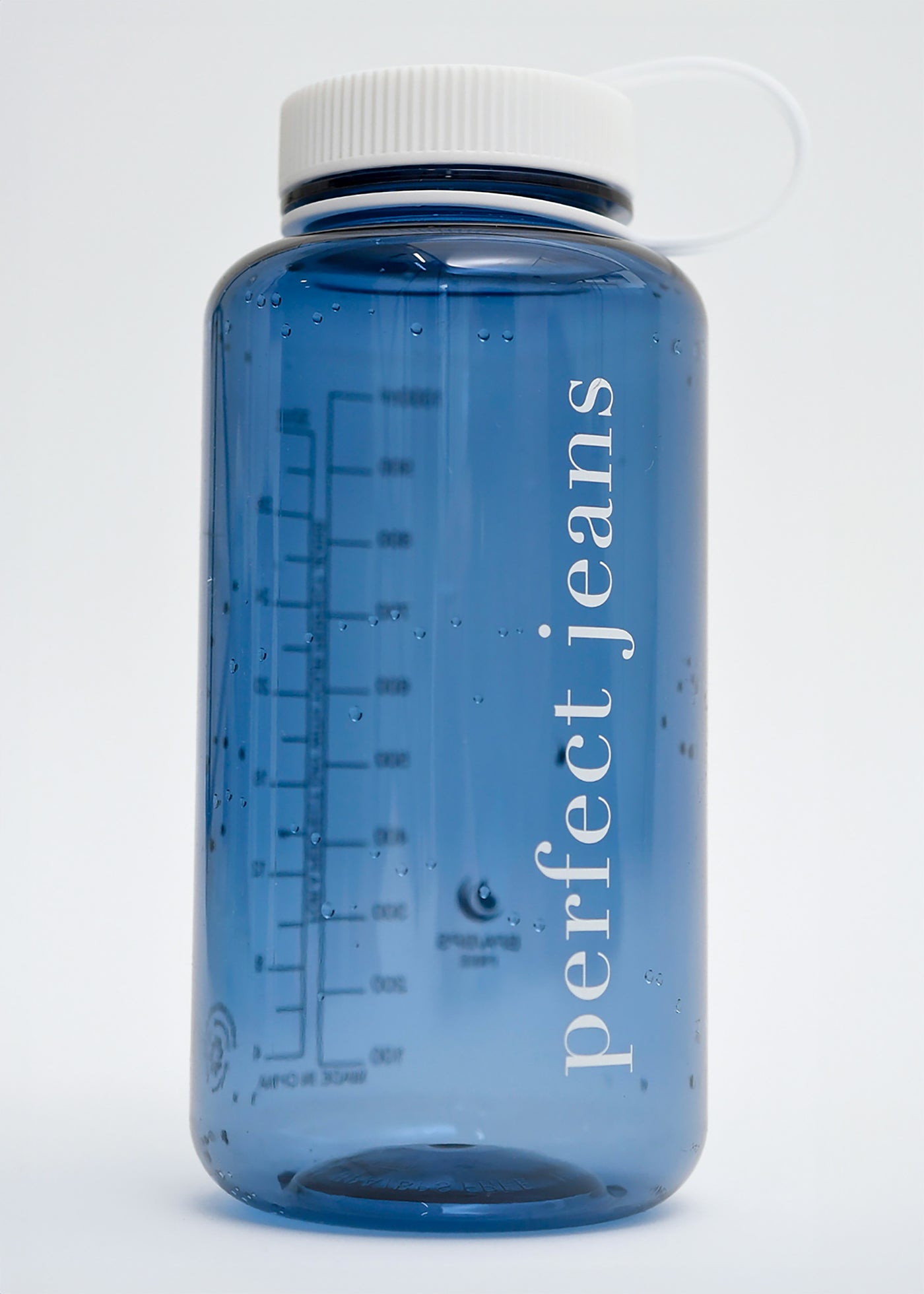 Gennemsigtig vandflaske i mørkeblå plast med hvidt låg og logo.