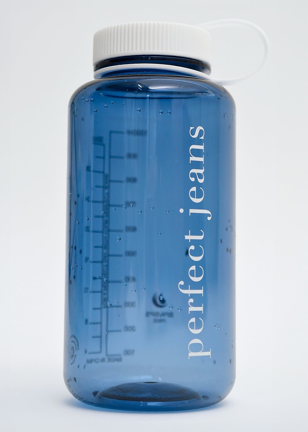 Flatlayer billede af denim jeans og vandflasker fra Perfect Jeans.