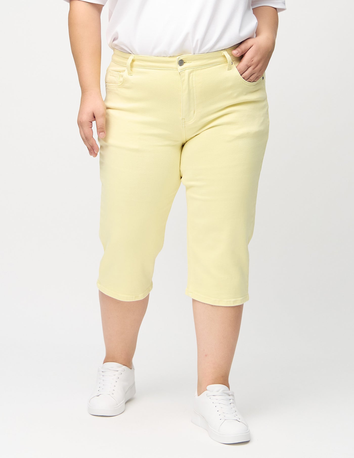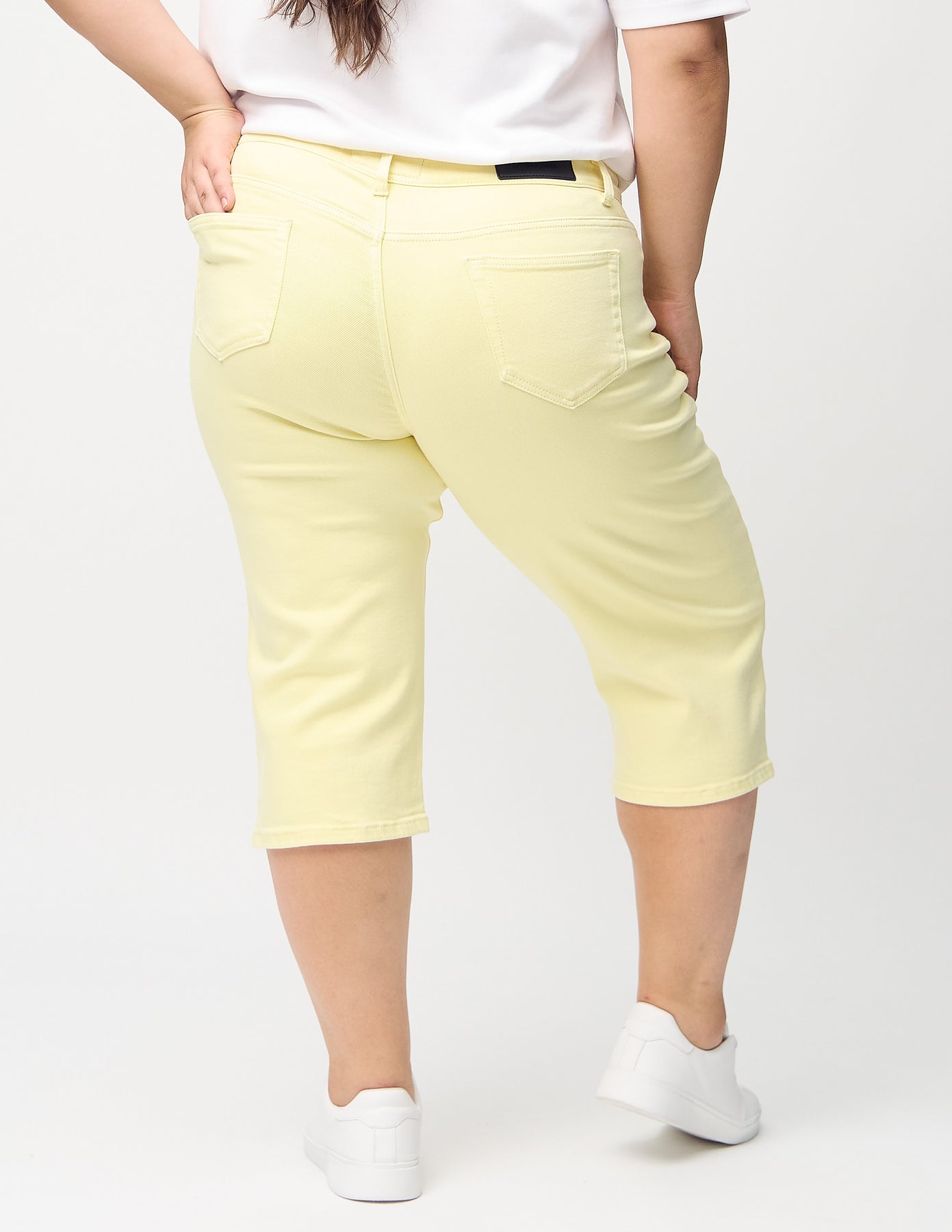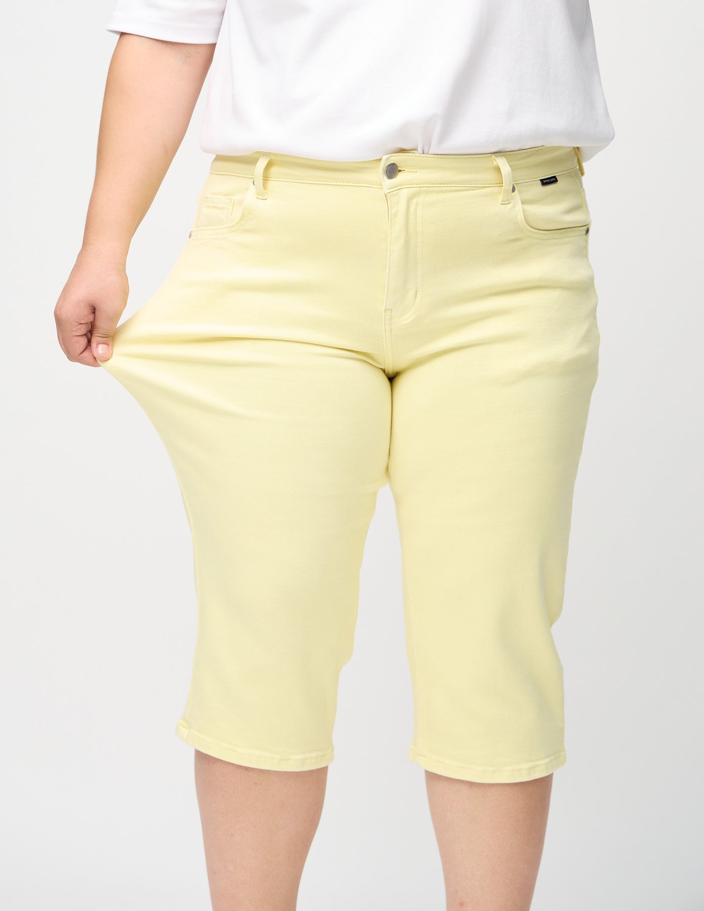 Forlommen på et par lysegule regular capris, hvor man kan se logoet på en plus-size model.