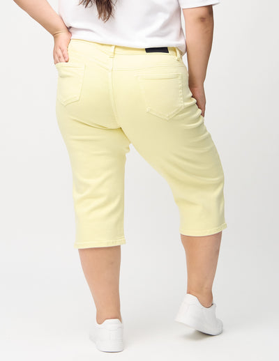 Lysegule regular capris, modelnavn Lemonades, som går lige ned langs benet på en plus-size model, set forfra.