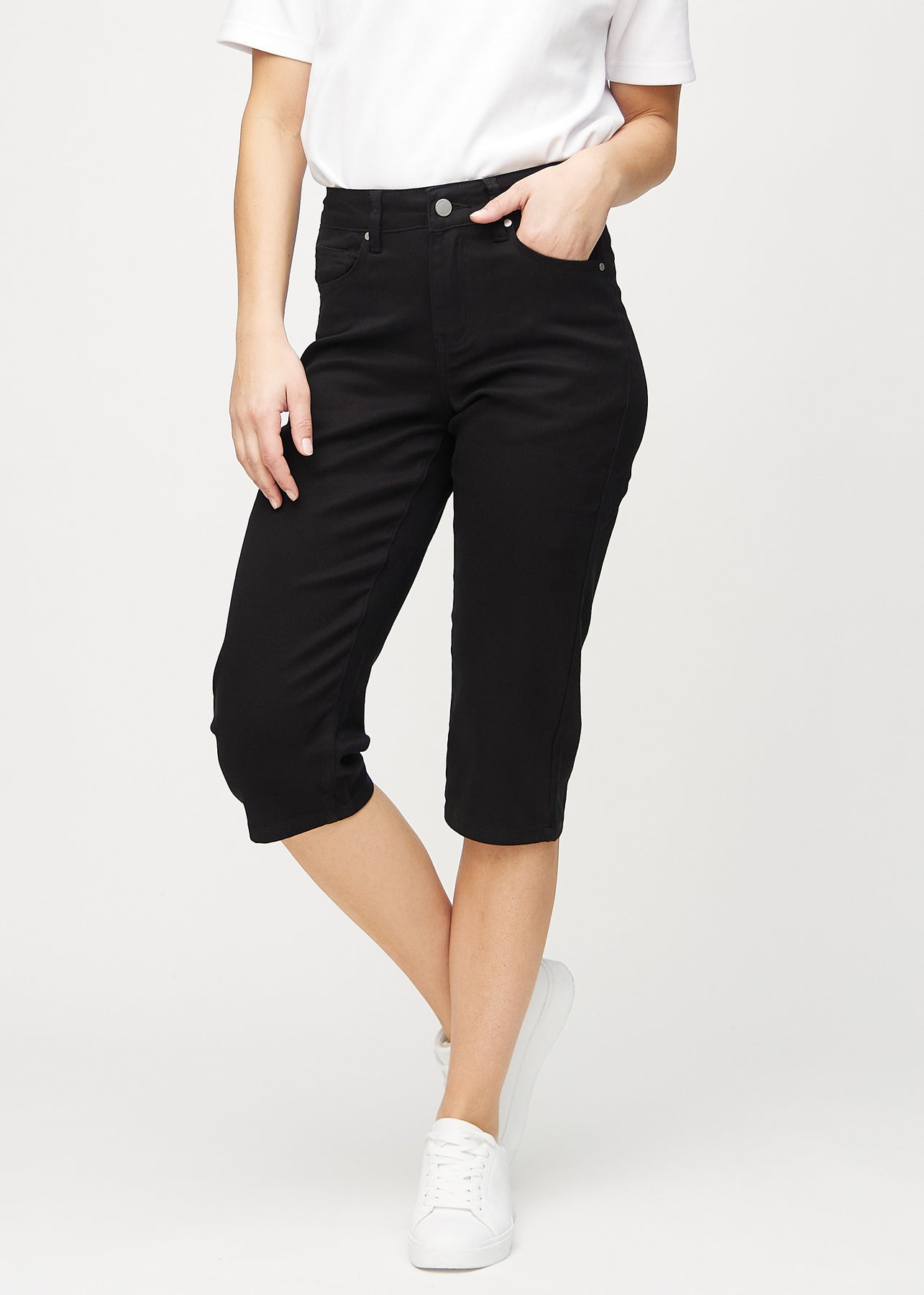 Fuldt billede af model i sorte regular capris.