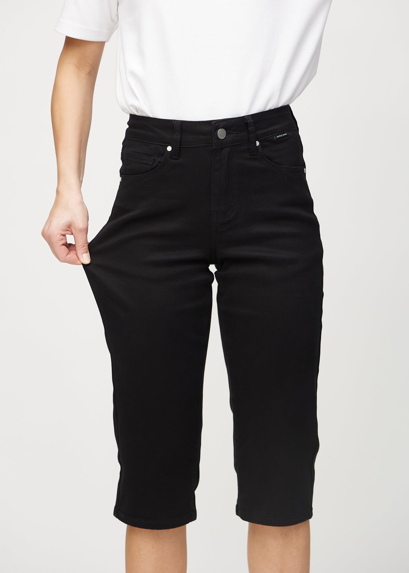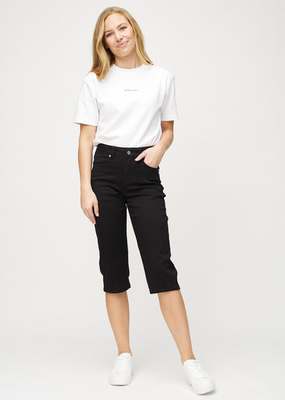 With Perfect Capris - Regular - Ravens you get the perfect black capris for women, which are stretchable and provide you with the highest comfort in everyday life. Our capris are in ¾ length and go just below the knee. This model is tight on the stomach and hips and is loose around the thigh. The classic black capris for ladies are high-waisted and are made with a special technology that ensures the color remains black wash after wash.