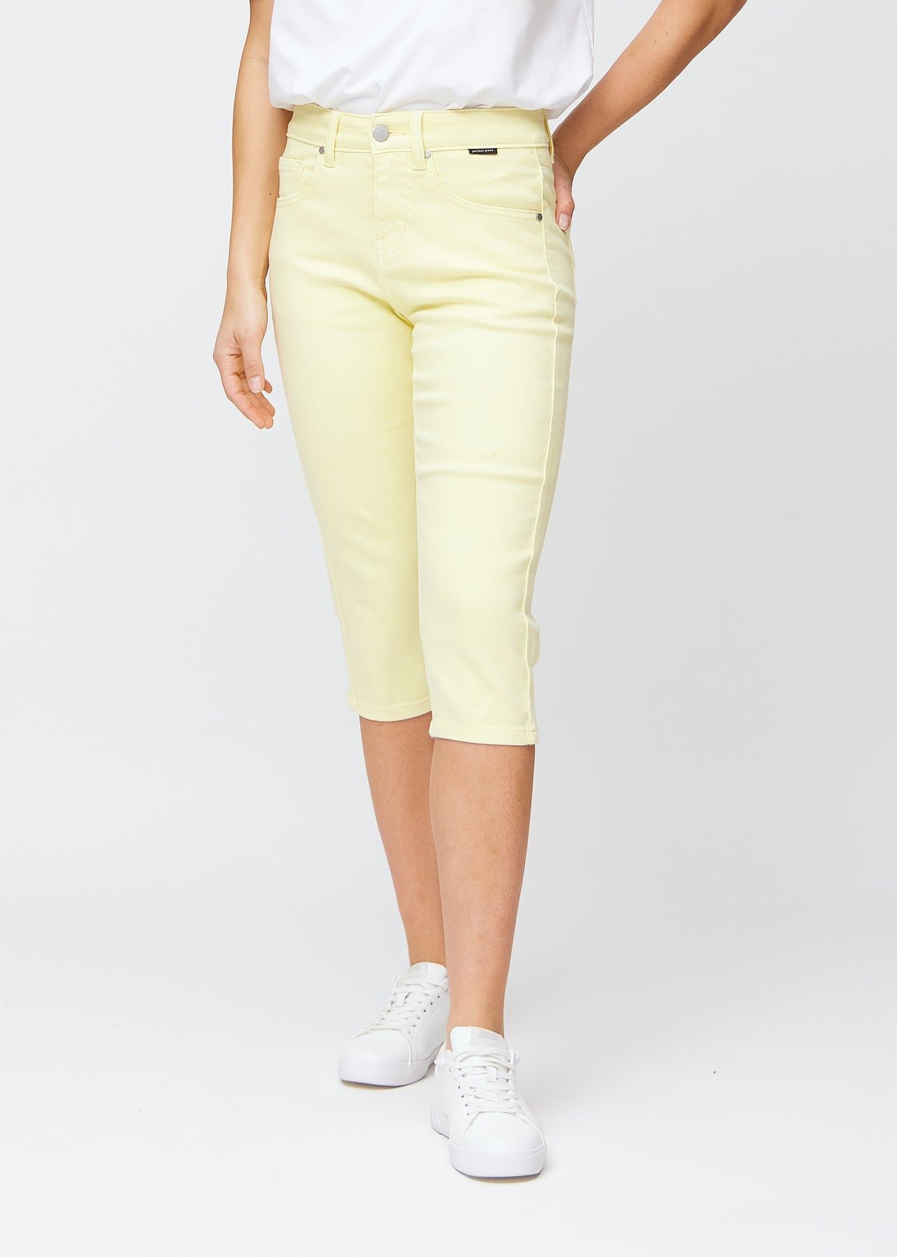 Lysegule slim capris, farve Lemonades, med tætsiddende pasform der former benene og slutter lige under knæet – set forfra.