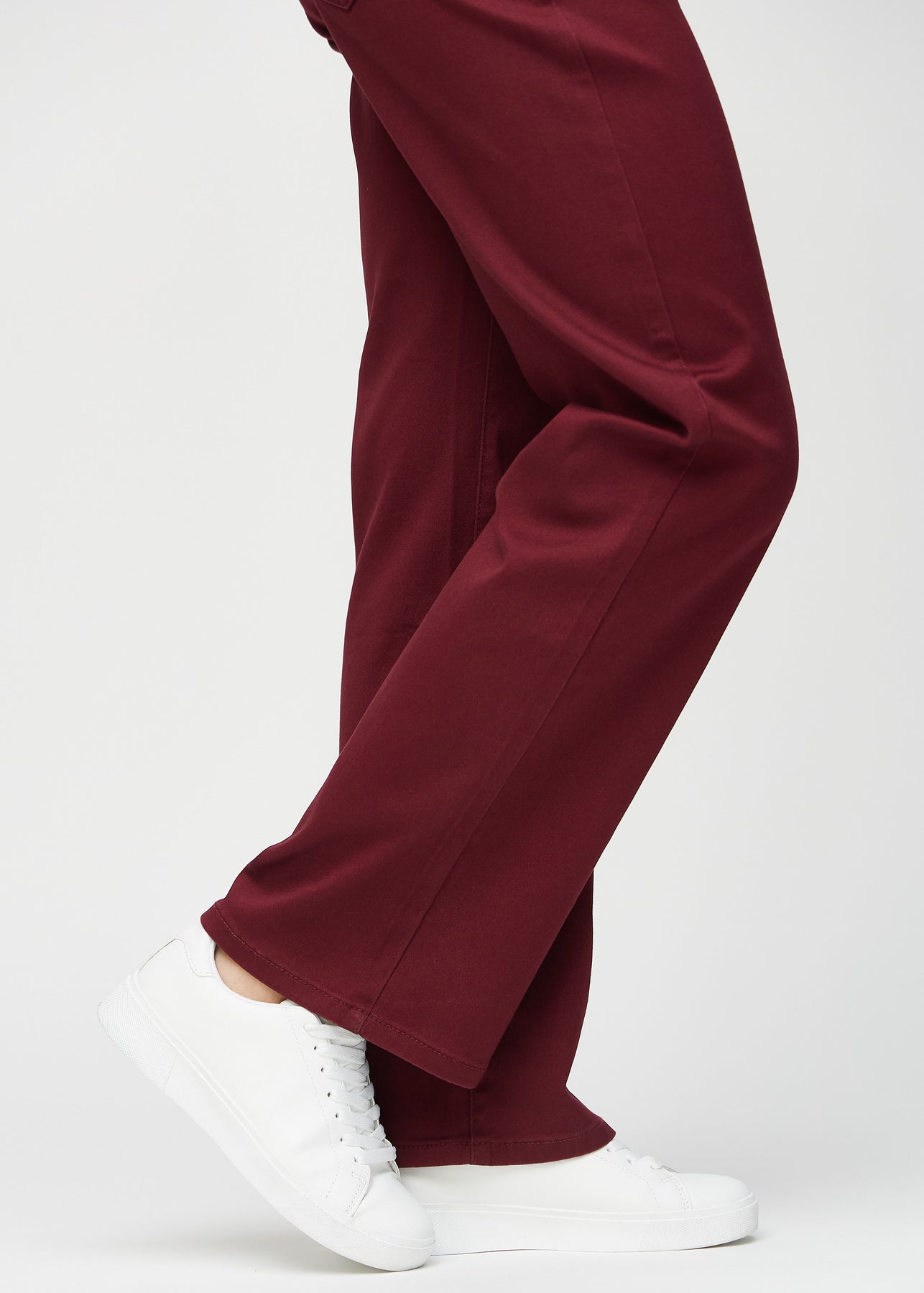 Fuldt billede af model i mørkerøde loose jeans.
