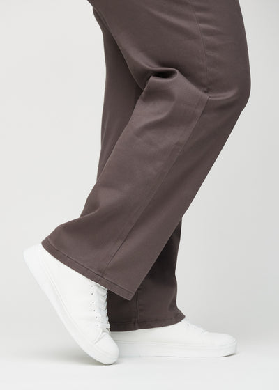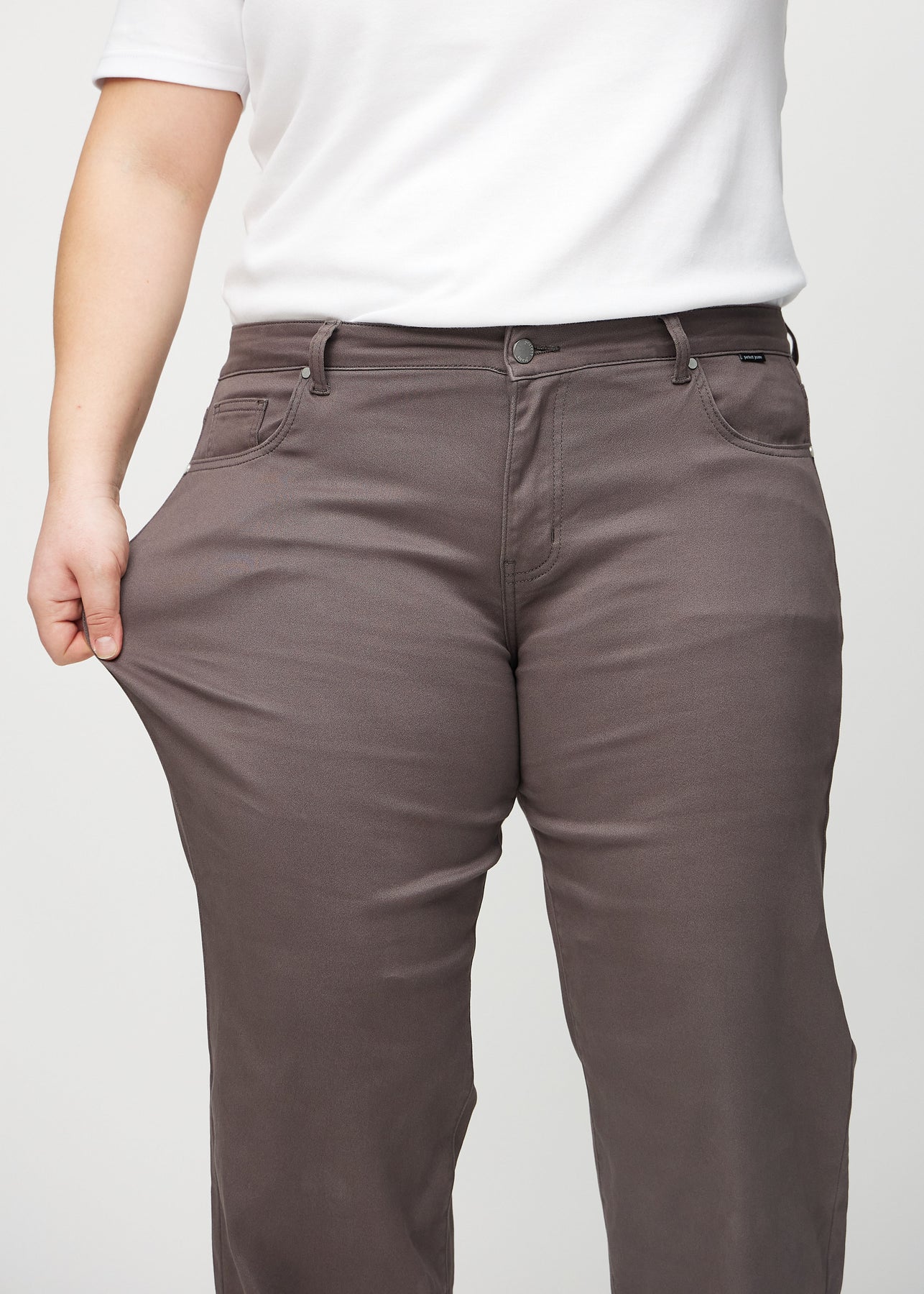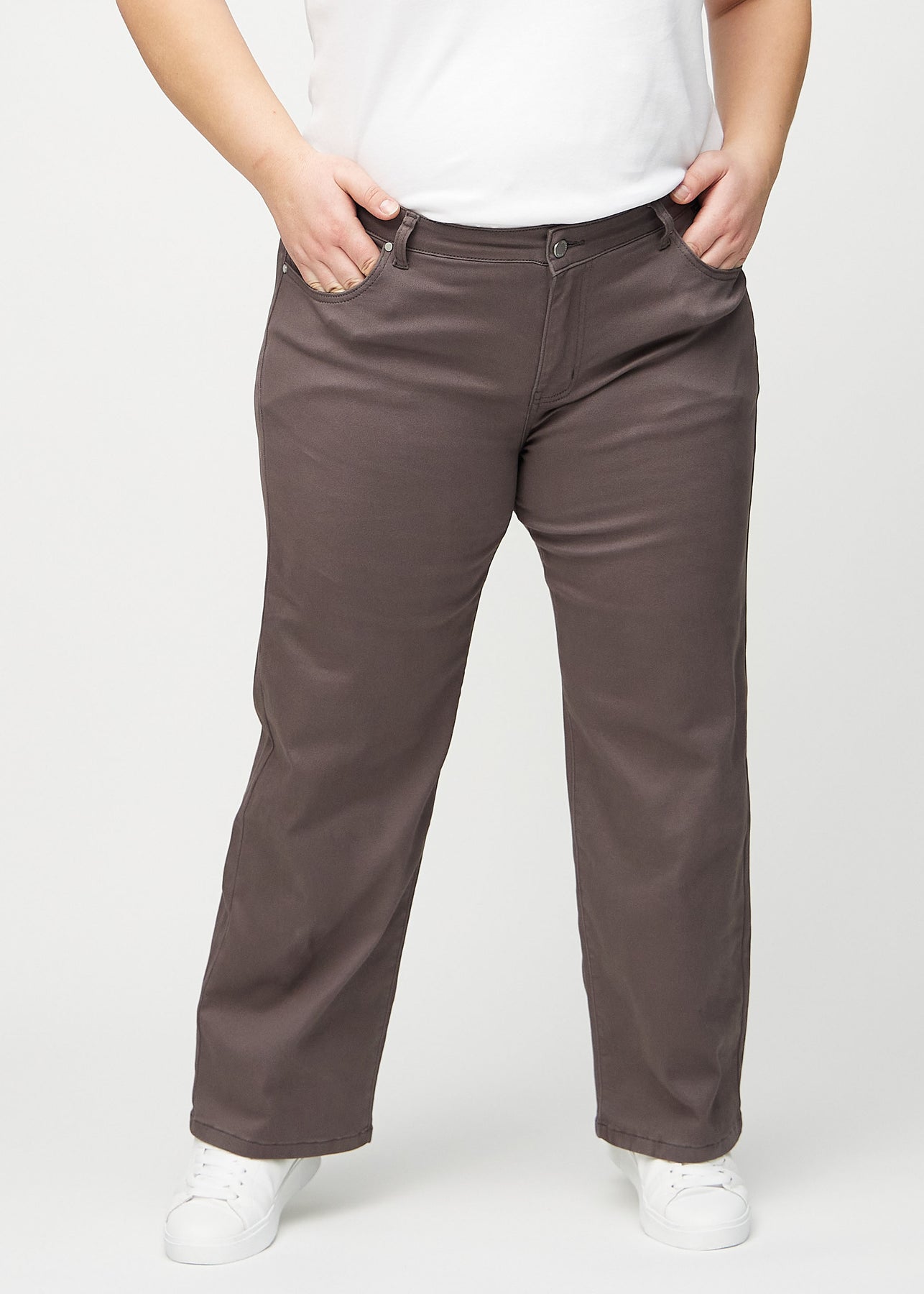 Gråbrune loose jeans set fra siden på en plus-size model.