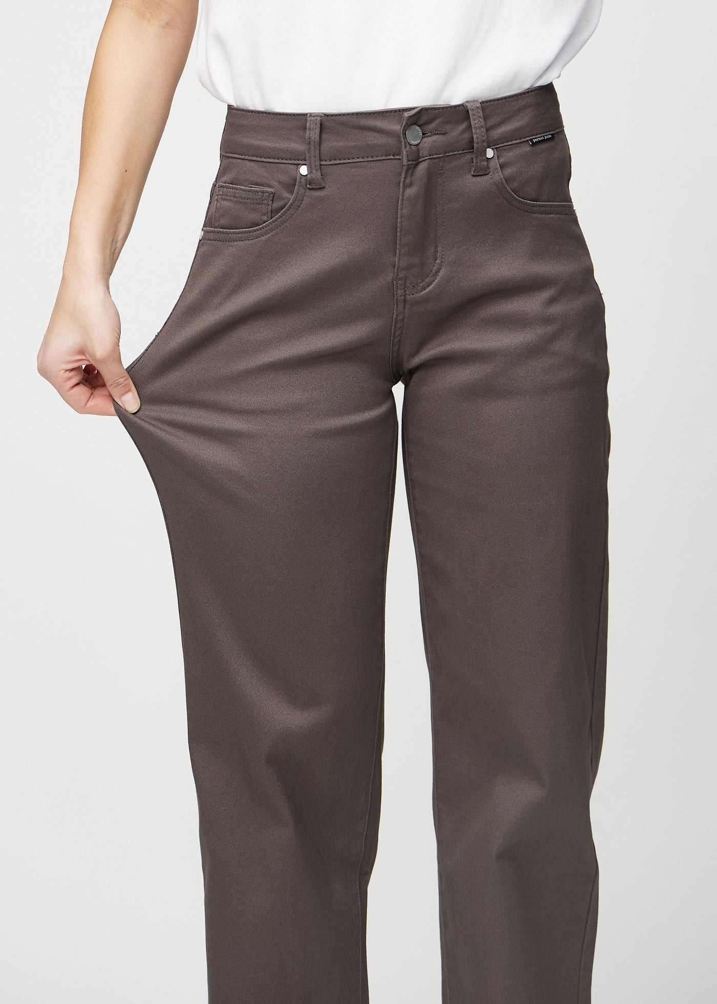 Forlommen på et par gråbrune loose jeans, hvor man kan se logoet på en plus-size model.