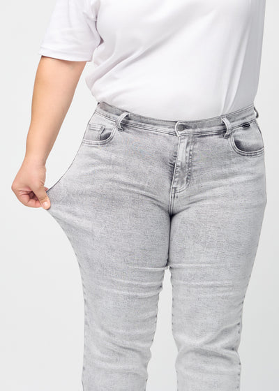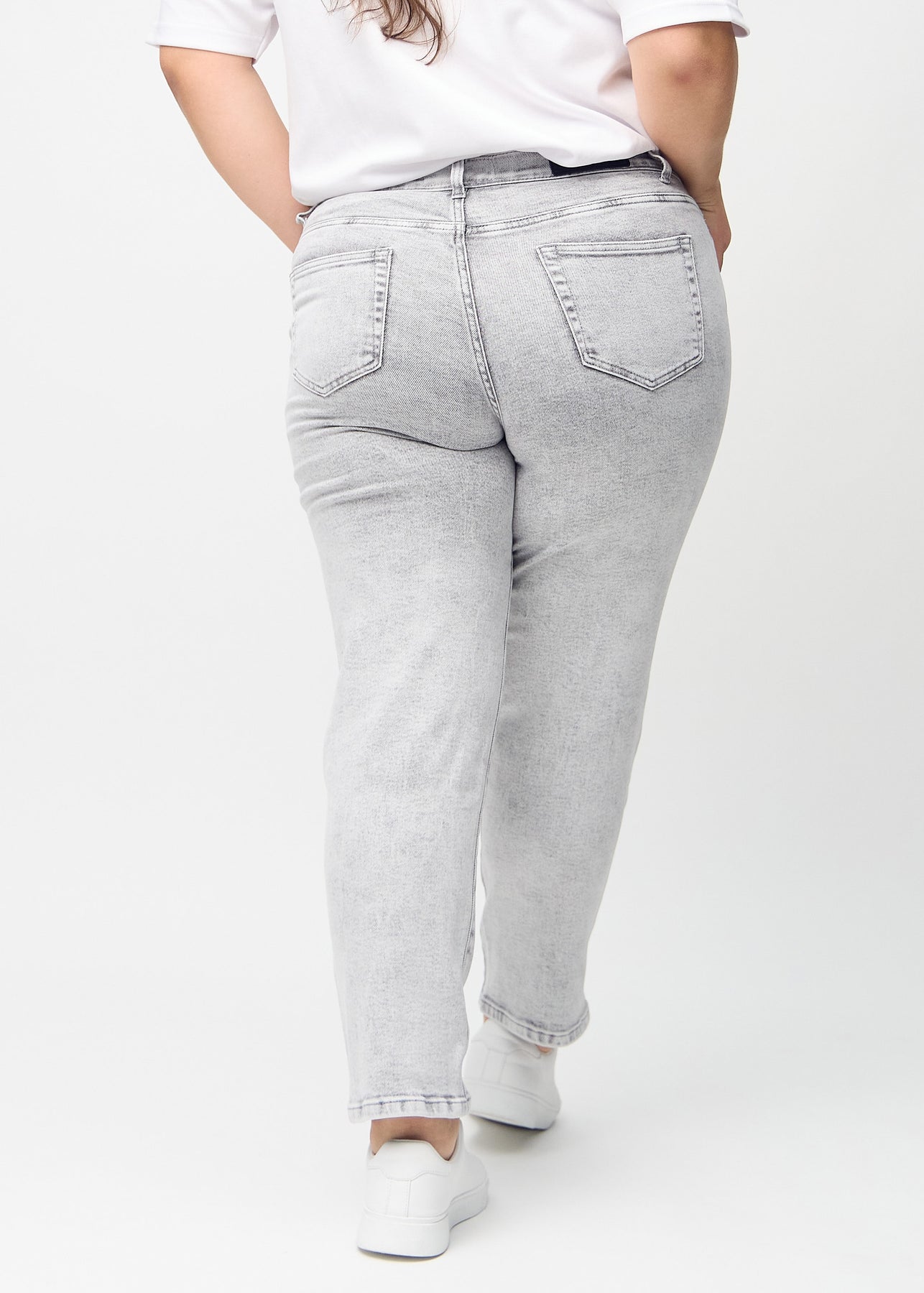 Fuldt billede af en plus-size model i lysegrå denim regular jeans.
