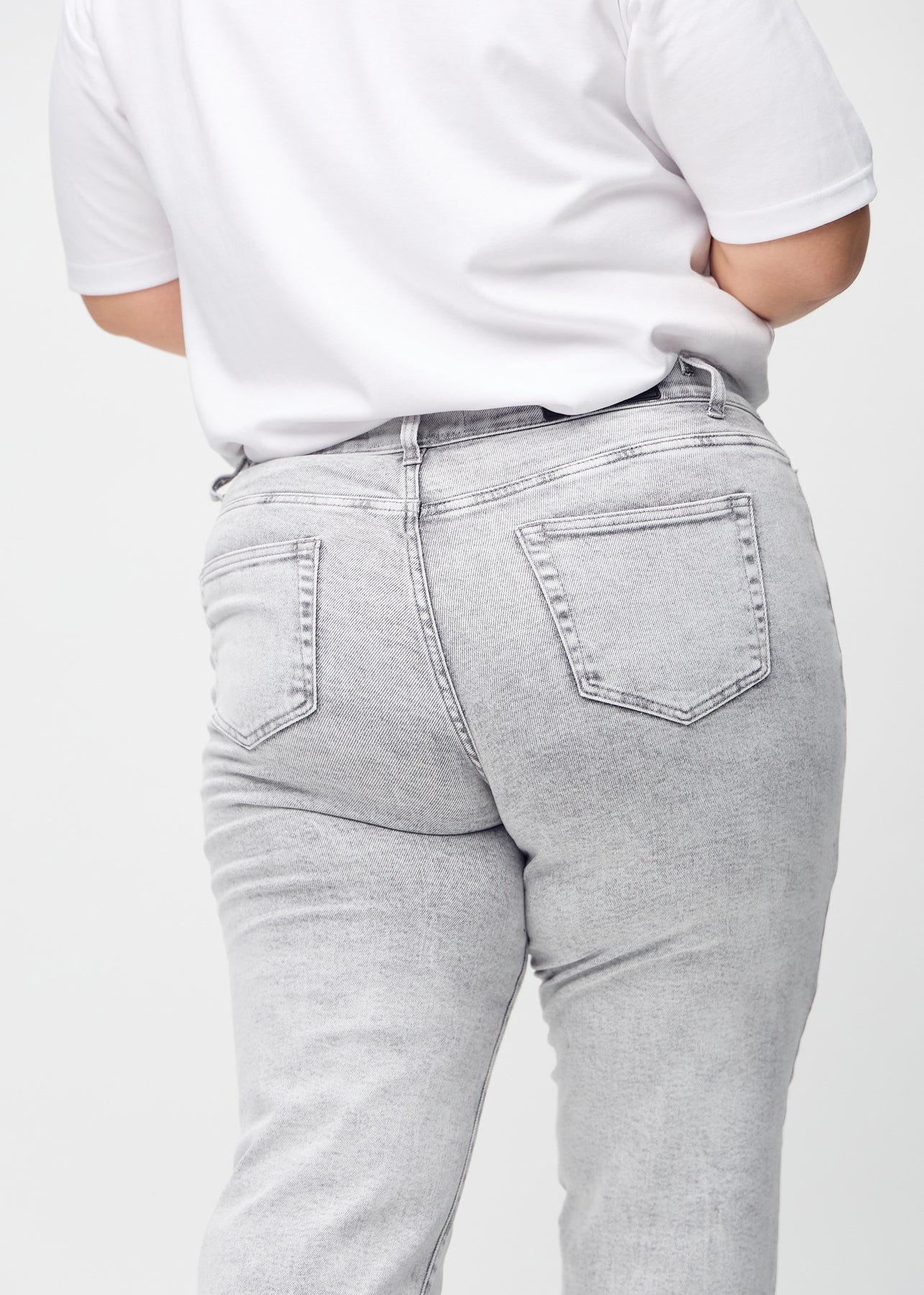 Lysegrå denim regular jeans set bagfra tæt på en plus-size model for at vise detaljer.