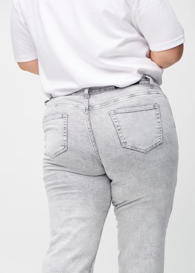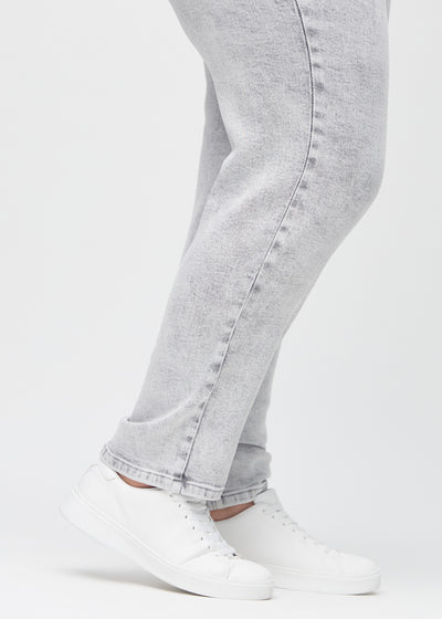 Lysegrå denim regular jeans, modelnavn Ashes, som går lige ned langs benet på en plus-size model, set forfra.