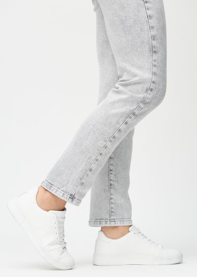 Lysegrå denim regular jeans, modelnavn Ashes, som går lige ned langs benet, set forfra.