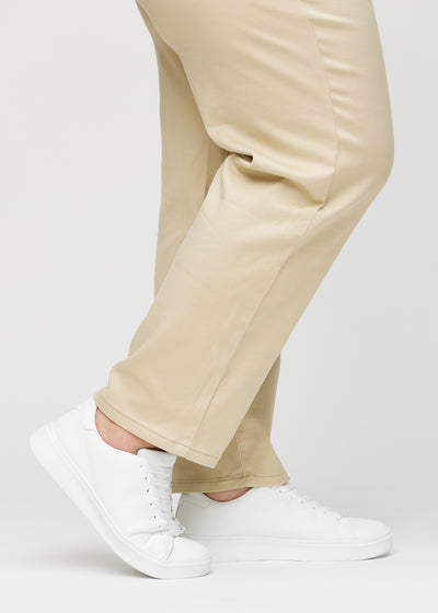 Beige regular jeans, modelnavn Gazelles, som går lige ned langs benet på en plus-size model, set forfra.