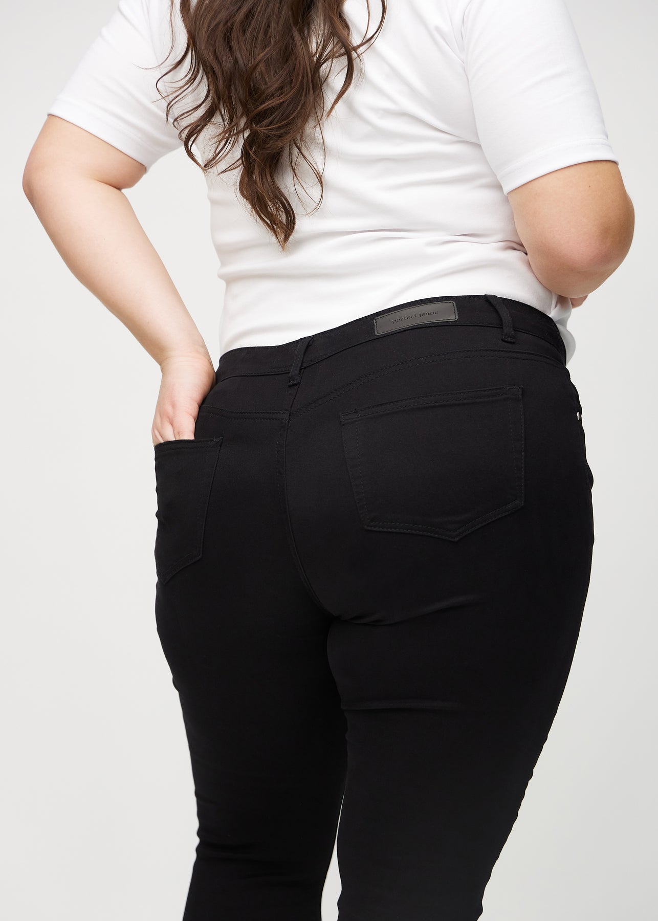 Sorte skinny jeans set bagfra på en plus-size model, så man kan se hele produktet.