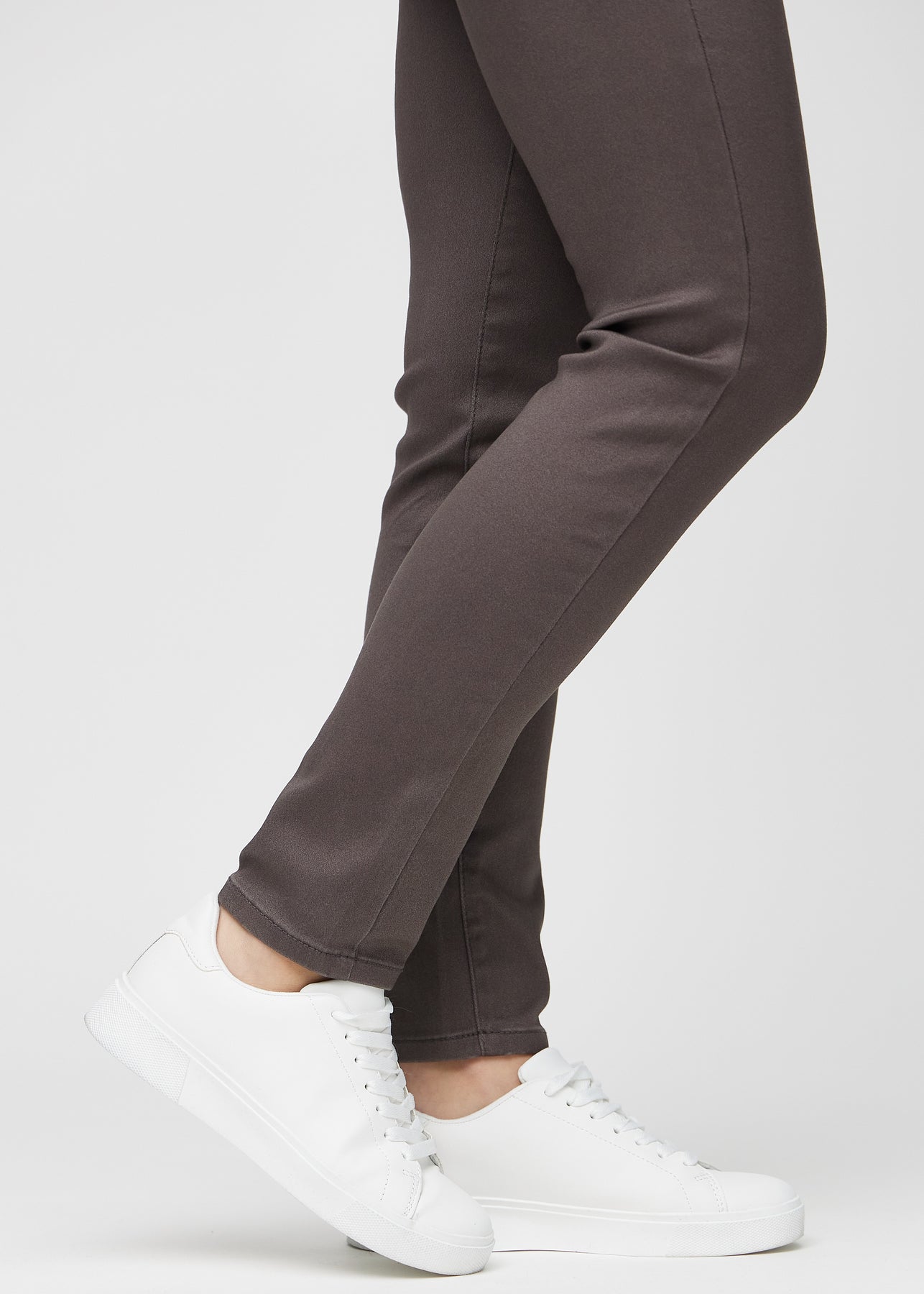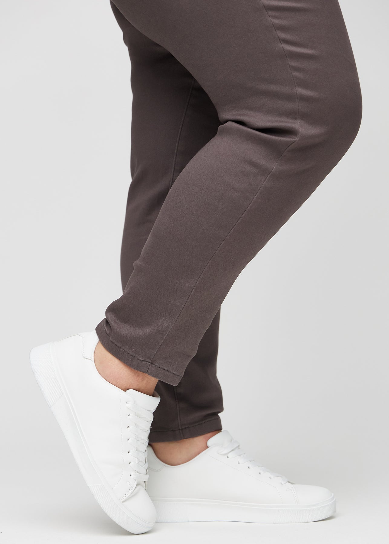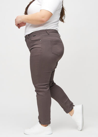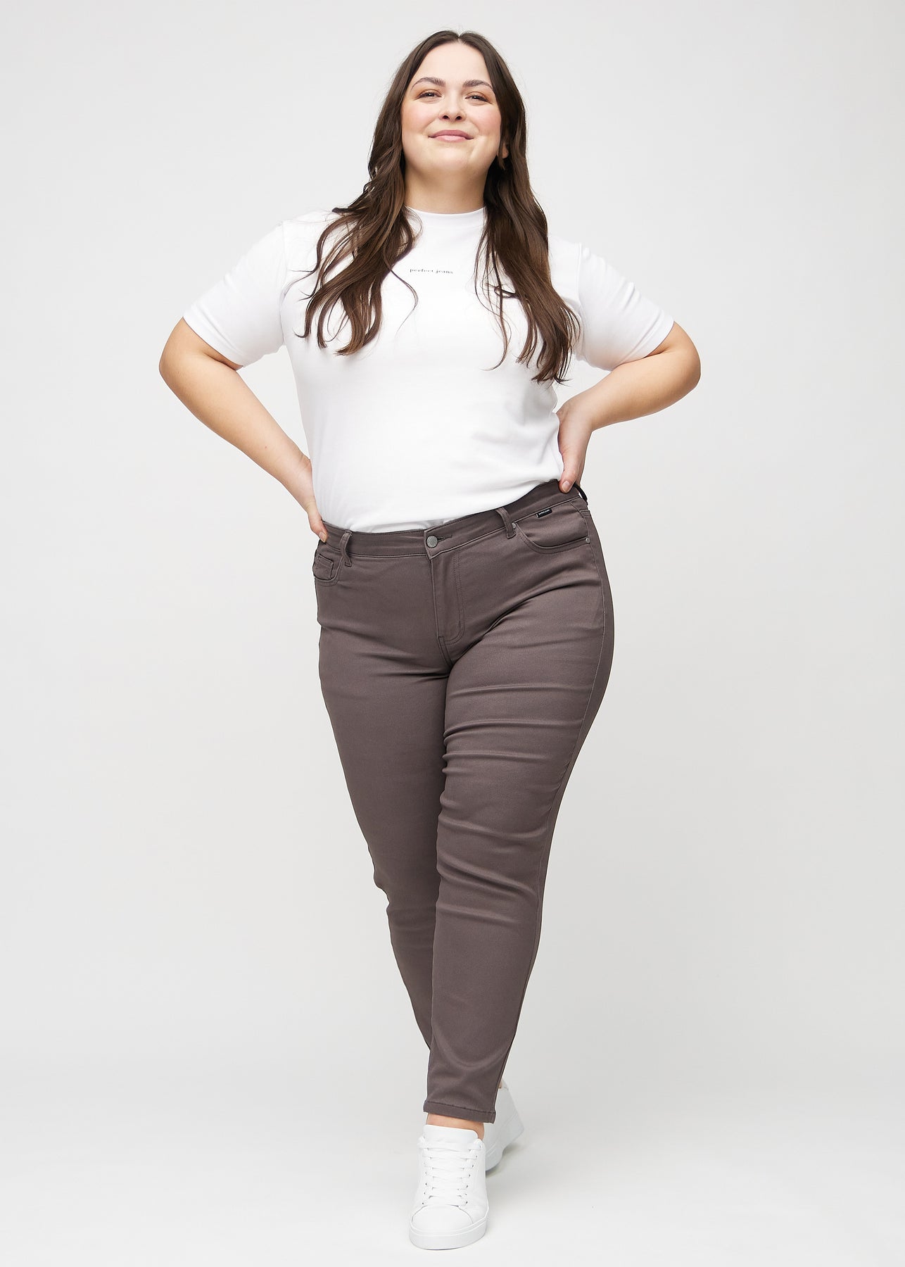 Gråbrune slim jeans set fra siden på en plus-size model.